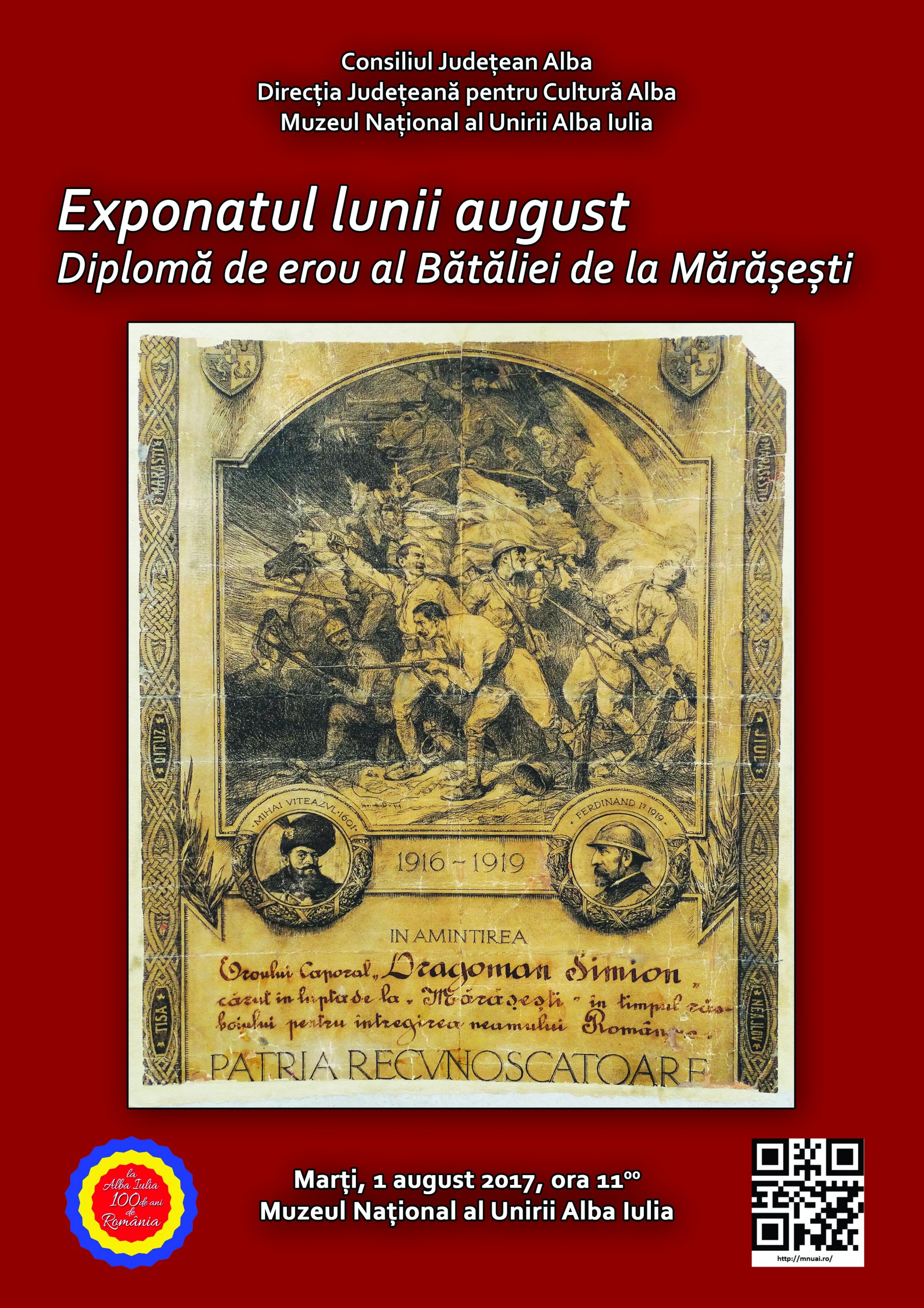 Marți, 1 august 2017, ora 11.00, la Muzeul Naţional al Unirii Alba Iulia va fi vernisat exponatul lunii august, ,,Diplomă de erou al Bătăliei de la Mărășești”.