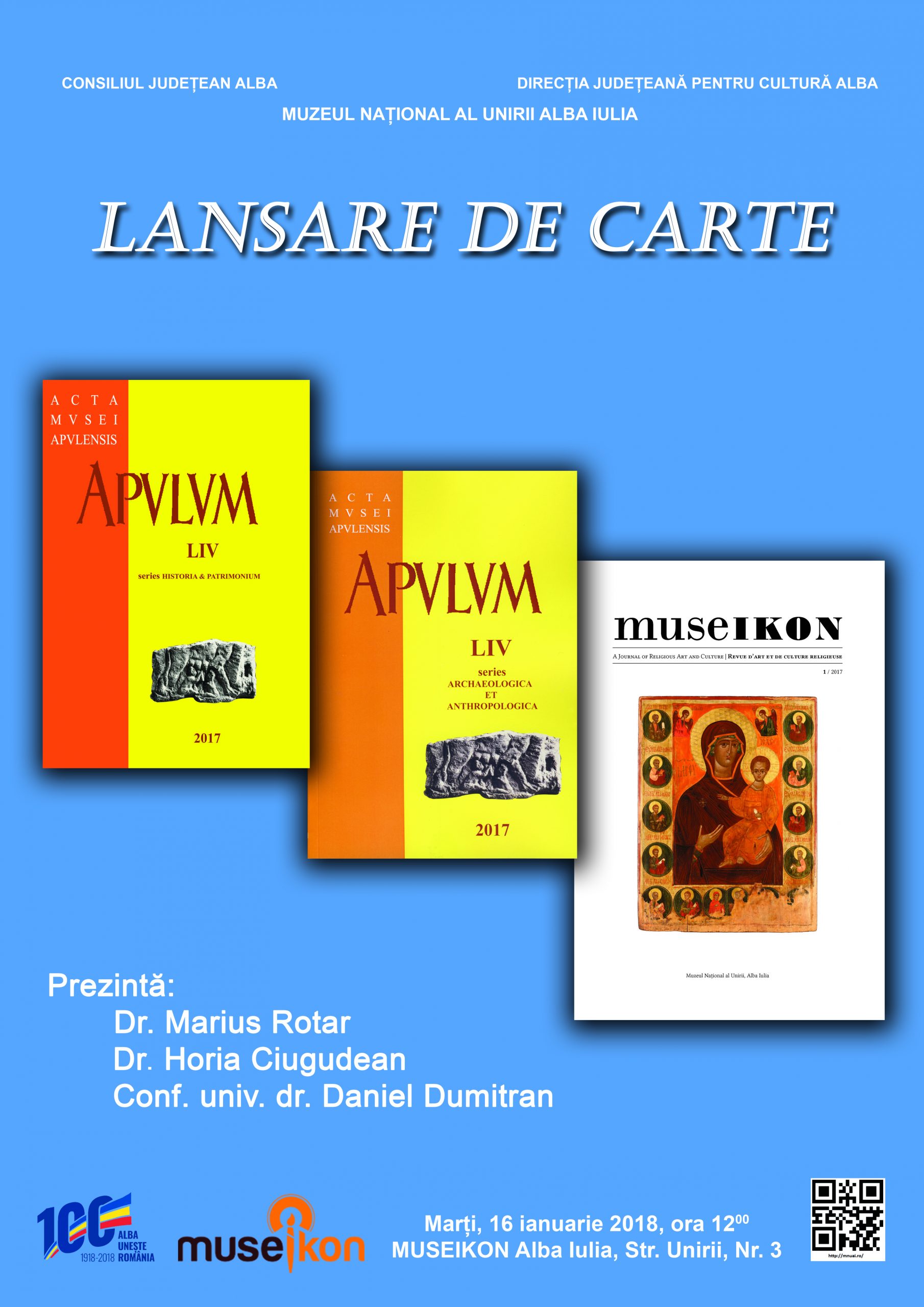 Museikon Alba Iulia Strada Unirii 3, Alba Iulia, Alba Iulia, AlbaLansarea volumelor Apvlvm Nr. 54 (Historia et Patrimonium şi Archaeologica et Anthropologica) şi revista Museikon Nr. 1 vor prezenta: Dr. Marius Rotar, Universitatea ,,1 Decembrie 1918" Alba Iulia Dr. Horia Ciugudean, Muzeul Naţional al Unirii Alba Iulia Conf. univ. dr. Daniel Dumitran, Universitatea ,,1 Decembrie 1918" Alba Iulia