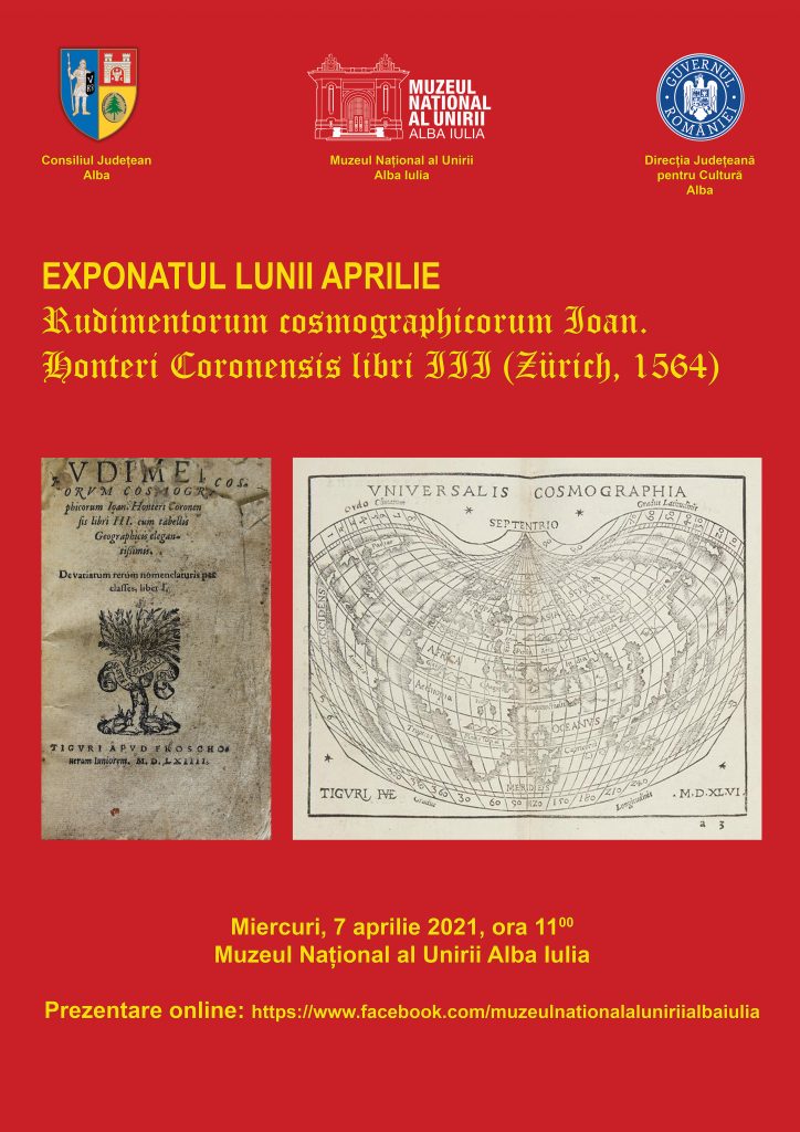 Miercuri, 7 aprilie 2021, ora 1100, la Muzeul Național al Unirii Alba Iulia va fi vernisat exponatul lunii aprilie: Rudimentorum cosmographicorum Ioan. Honteri Coronensis libri III (Zürich, 1564).