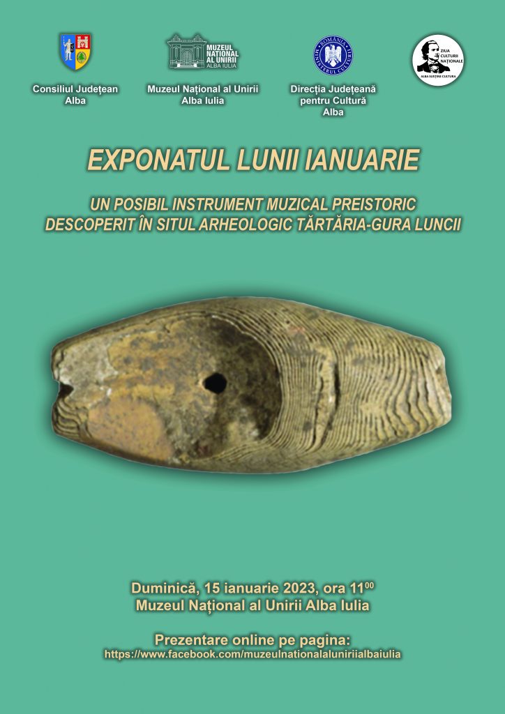 Duminică, 15 ianuarie 2023, ora 11:00, la Muzeul Național al Unirii Alba Iulia va fi vernisat exponatul lunii ianuarie: Un posibil instrument muzical preistoric, descoperit la Tărtăria – Gura Luncii.
