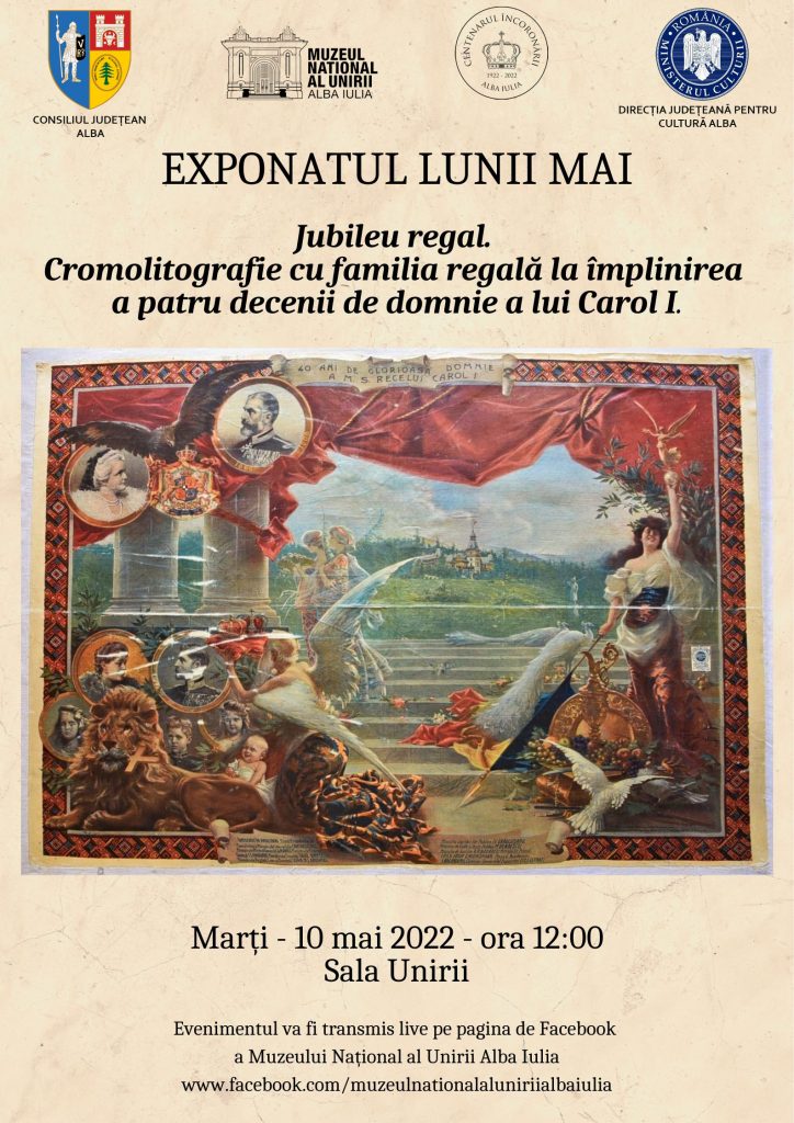 Cu ocazia zilei Regalității, marți, 10 mai 2020, la ora 12:00, la Sala Unirii Alba Iulia, va fi vernisat exponatul lunii mai, intitulat „Jubileu regal. Cromolitografie cu familia regală la împlinirea a patru decenii de domnie a lui Carol I.”
