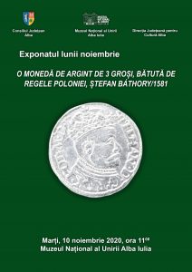 Marți, 10 noiembrie 2020, ora 11:00, la Muzeul Național al Unirii Alba Iulia va fi vernisat exponatul lunii noiembrie, O monedă de argint de 3 groși, bătută de regele Poloniei, Ștefan Báthory/1581.