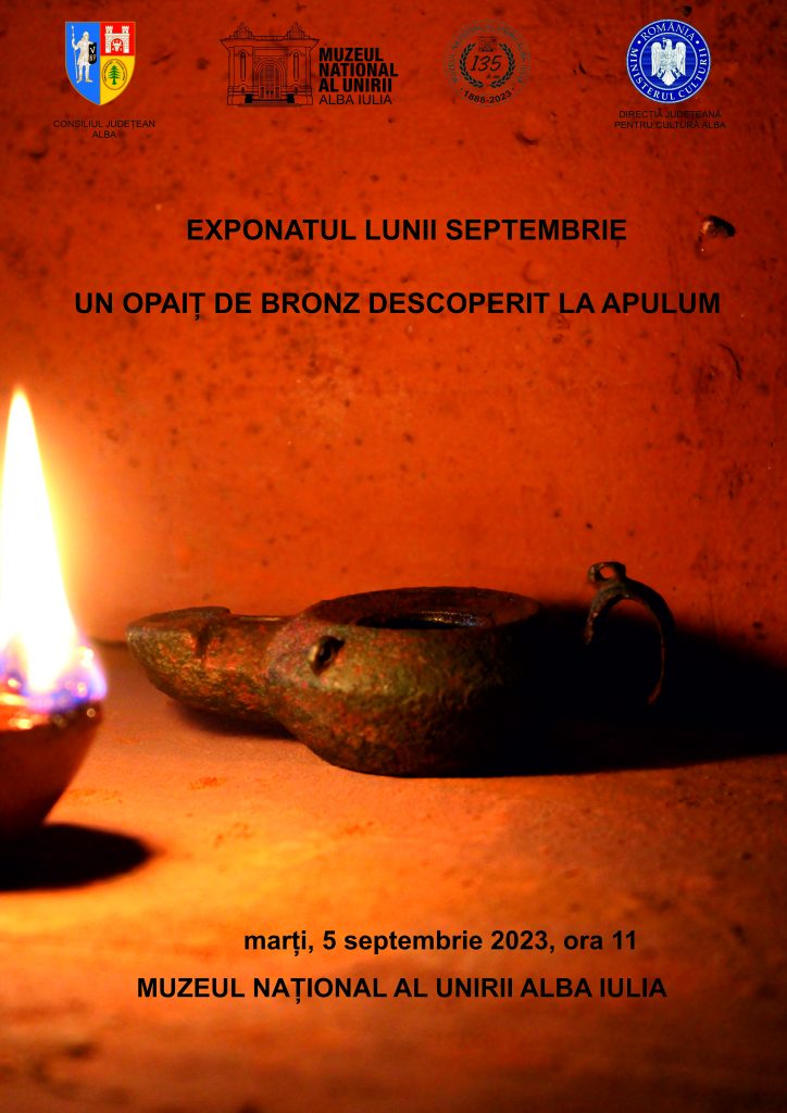 Marți, 5 septembrie 2023, ora 11:00, la Muzeul Național al Unirii Alba Iulia va fi vernisat exponatul lunii septembrie „Un opaiț de bronz descoperit la Apulum”. Opaițele de bronz reprezintă o raritate nu doar pentru siturile romane din Dacia ci și pentru lumea provincială romană, în general. Un asemenea opaiț a fost descoperit la Apulum în anul 2020. Descoperirea a fost ocazionată de realizarea unei cercetări arheologice preventive în Alba Iulia, în zona de nord a sitului. Suprafața cercetată este amplasată în arealul ocupat odinioară de canabele Legiunii a XIII–a Gemina, la aproximativ 600 de metri nord-vest de castrul acestei unități militare, și 300 de metri spre est de necropola nordică.