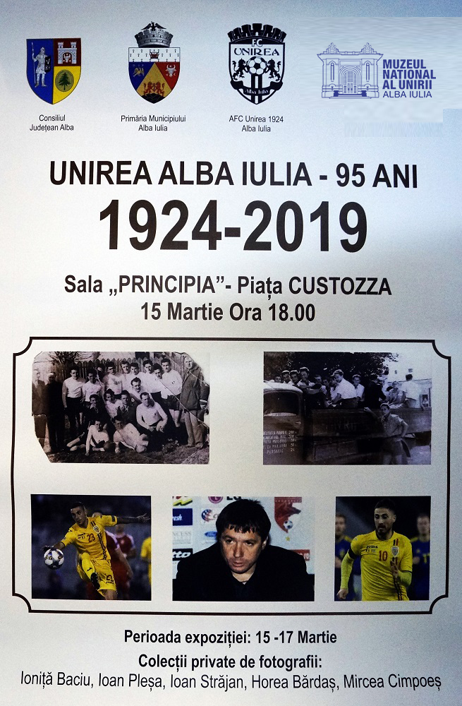 Expoziția “Unirea Alba Iulia – 95 ani 1924-2019” este organizată de actuala divizionară terță AFC Unirea 1924 Alba Iulia, în colaborare cu Consiliul Județean Alba, Primăria municipiului Alba Iulia și Muzeul Național al Unirii Alba Iulia. În urmă cu 5 ani, într-un alt moment special, la împlinirea a 9 decenii de existență a formației “alb-negre”, o altă expoziție fotografică a fost prezentată în Alba Mall.