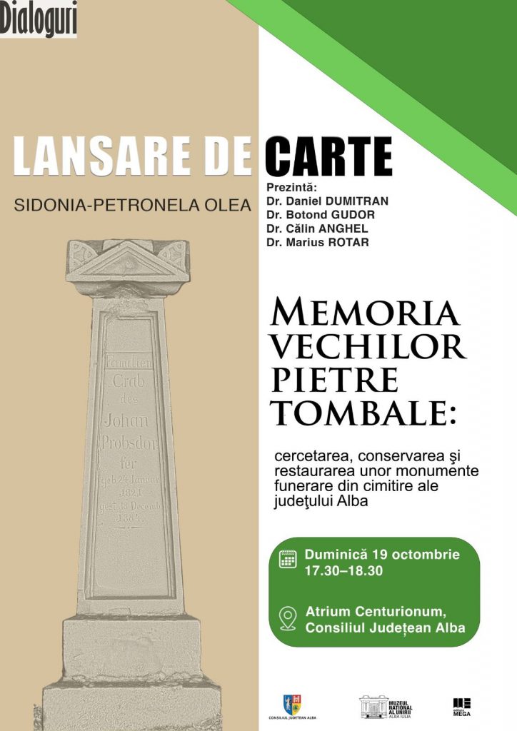 Vă invităm la evenimentul de lansare a volumului Memoria vechilor pietre tombale: cercetarea, conservarea și restaurarea unor monumente funerare din cimitire ale județului Alba, semnat de Sidonia-Petronela Olea.