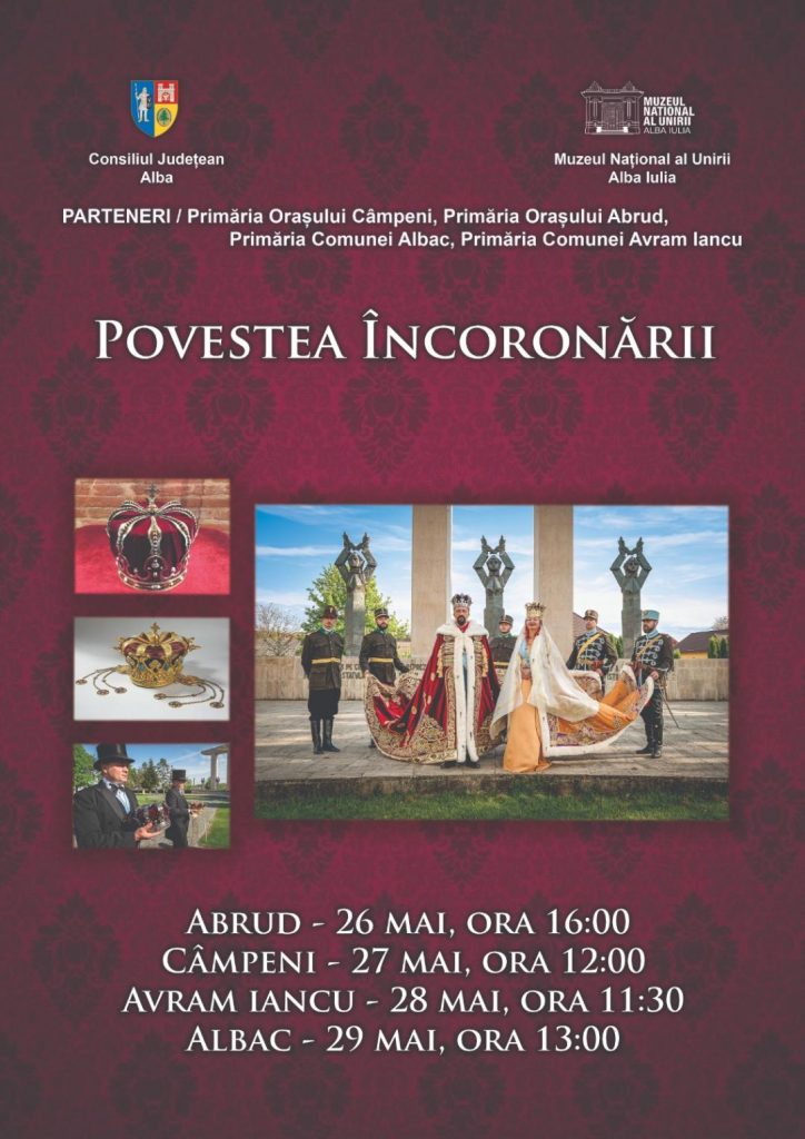 Muzeul Național al Unirii Alba Iulia promovează actul de la 15 octombrie 1922, când la Alba Iulia, au fost încoronați ca regi ai României Mari, Ferdinand și Maria, sub forma inedită, a reconstituirii istorice. Astfel, începând de joi, 26 mai, până duminică, 29 mai, istorici și voluntari ai muzeului albaiulian, însoțiți de membrii Asociației Culturale Historia Renascita din Pitești, vor fi prezenți la Abrud, Câmpeni, Avram Iancu și Albac, unde vor ține o adevărată lecție de istorie vie, intitulată sugestiv, Povestea Încoronării.